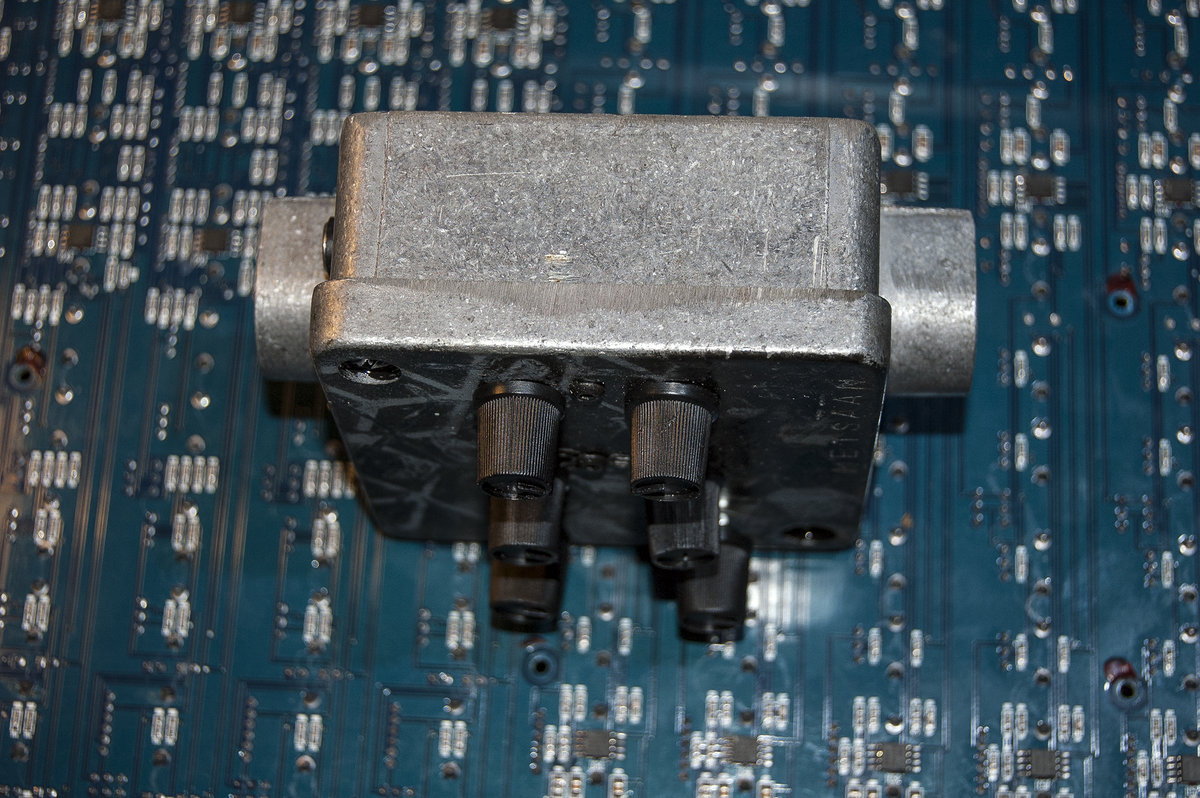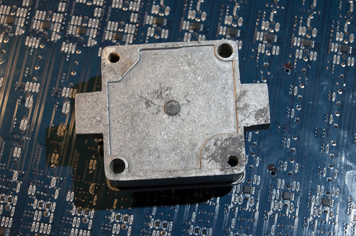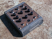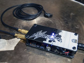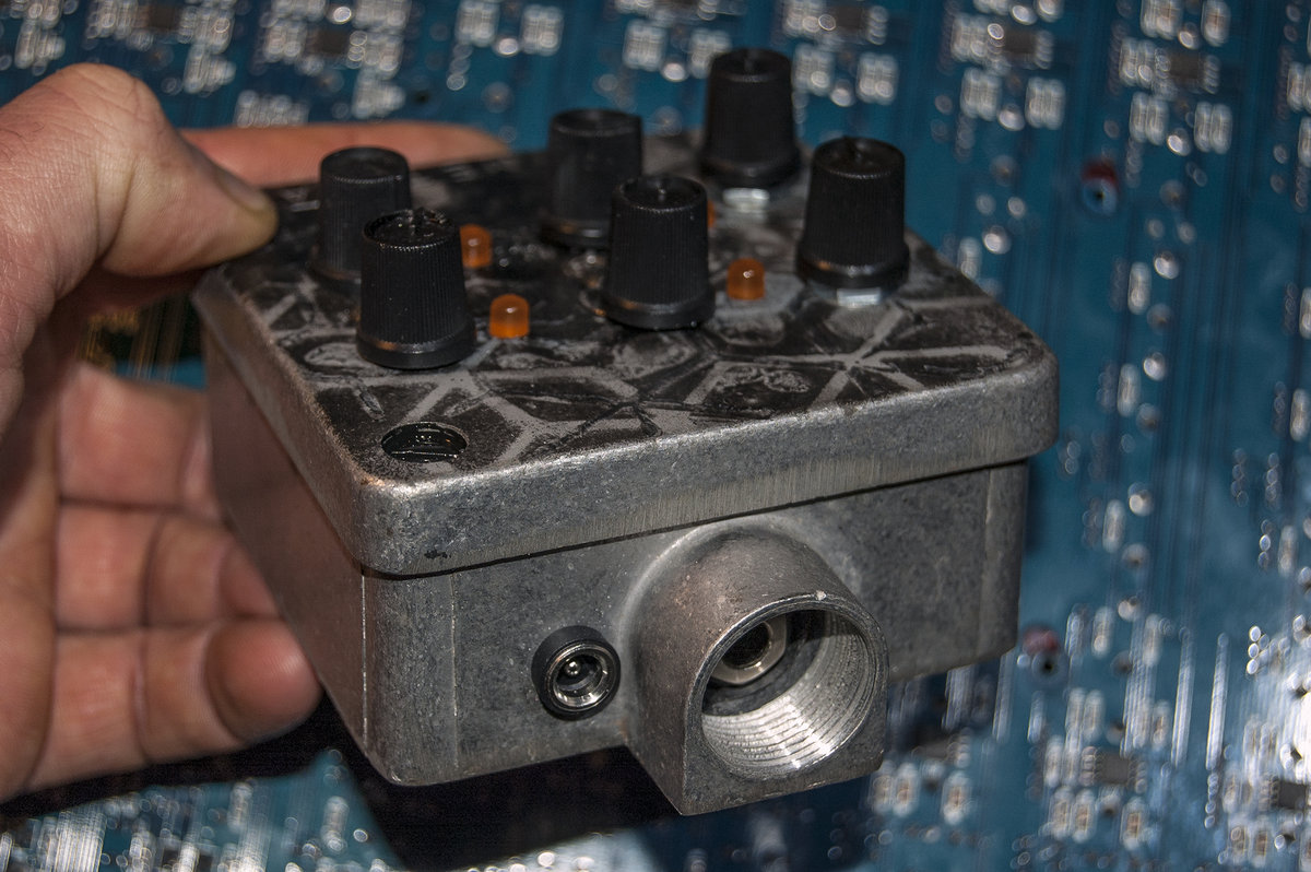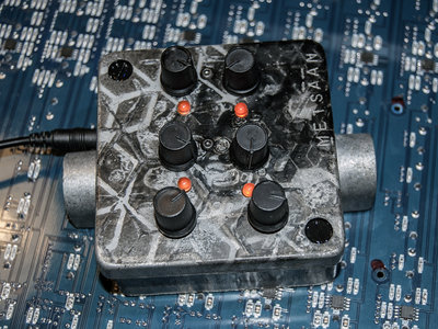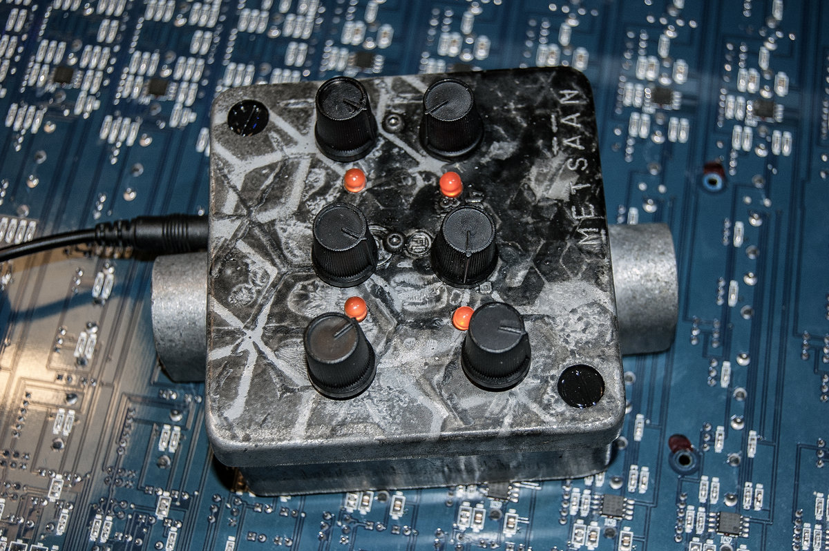 A simple small binaural/stereo capsule, which used to be a power cable connector enclosure made from die cast aluminum. Hand painted with ‘broken hexagon’ patterns and with an embossed METSÄÄN stamp. This machine contains 2 ‘reverse avalanche’ oscillator pairs per channel, each channel has a dedicated ‘EHX style’ booster and volume control. Each of the 4 oscillators has a frequency control pot and an orange indicator LED, that is actually part of the audio circuit, it dims and flickers slightly on low frequency settings and flares up with higher frequencies. The stereo output signal can either be routed through one 6.3mm stereo socket (located on the side where the power input socket is). When a second 6.3mm mono jack is inserted into the other socket the signal gets split into 2 mono channels on each output. The BINAURAL DRONE CAPSULE runs on 12V DC (euro-plug power adapter included, if you need it.) Dimensions: 9cm x 9cm (without the socket protection ‘ears’, those stick out 1.5cm) x 6.4cm (including knobs).