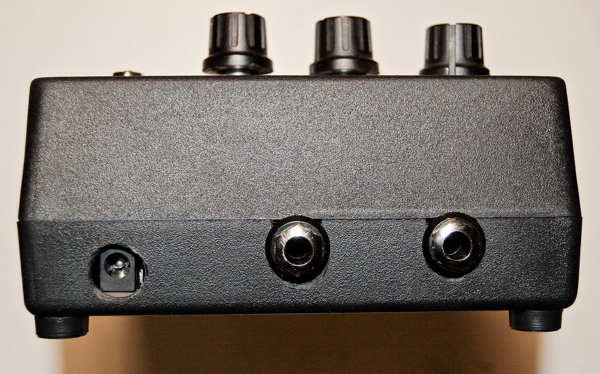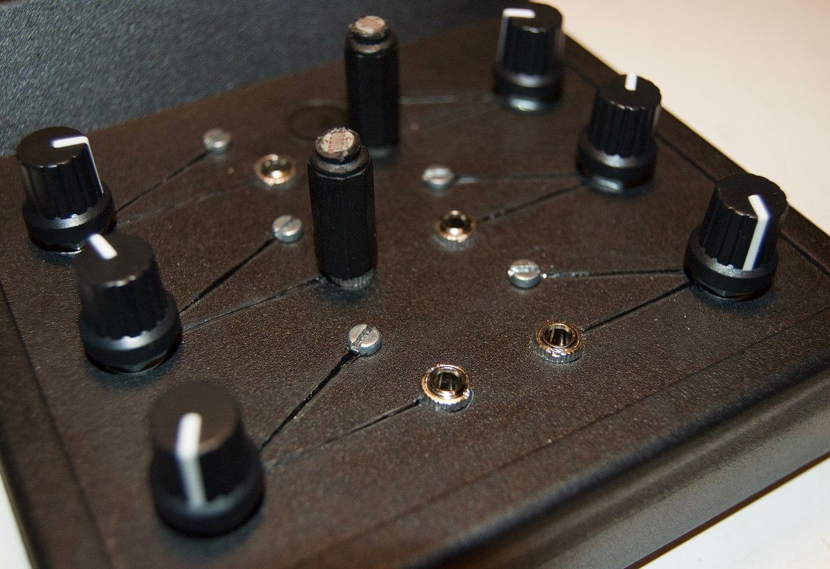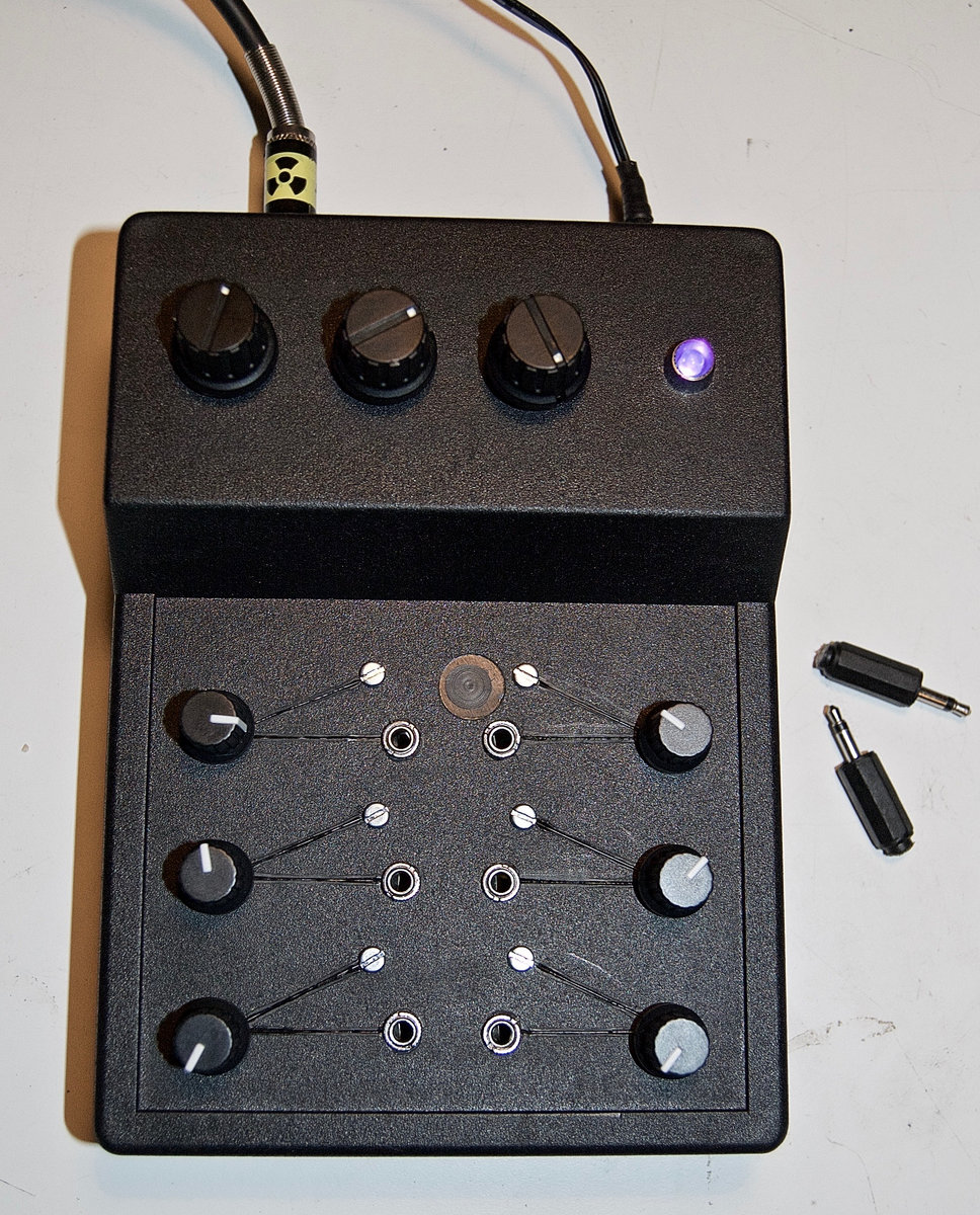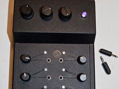 Handmade bass-heavy drone generator based on the “808Cydrone-circuit” in black plastique case with burnt in line-work. Get lost in drones that slowly evolve and shift by mixing the sounds of the 6 oscillators. Each has a VOLUME control, a body-contact and/or by a light sensitive LDR plug-in (the 3.5mm mono-socket of that works as a second body-contact and can also be used for other variable resistors, such as ribbon pots). EXPERIMENTAL RESISTANCE. The audio sum of the 6 oscillators and an optional external input (mono) run through a highly resonant low-pass filter with FREQUENCY and a RESONANCE control. The audio input let’s you run external audio signals through the filter, so you can also use this DIRTY DRONE as standalone filter. This device has an ultra violet power indicator LED and a OUTPUT VOLUME control. Including 12VDC PSU (euro) and 2 LDR-plugs.
