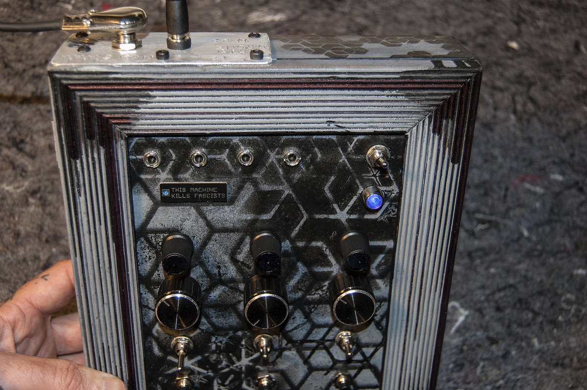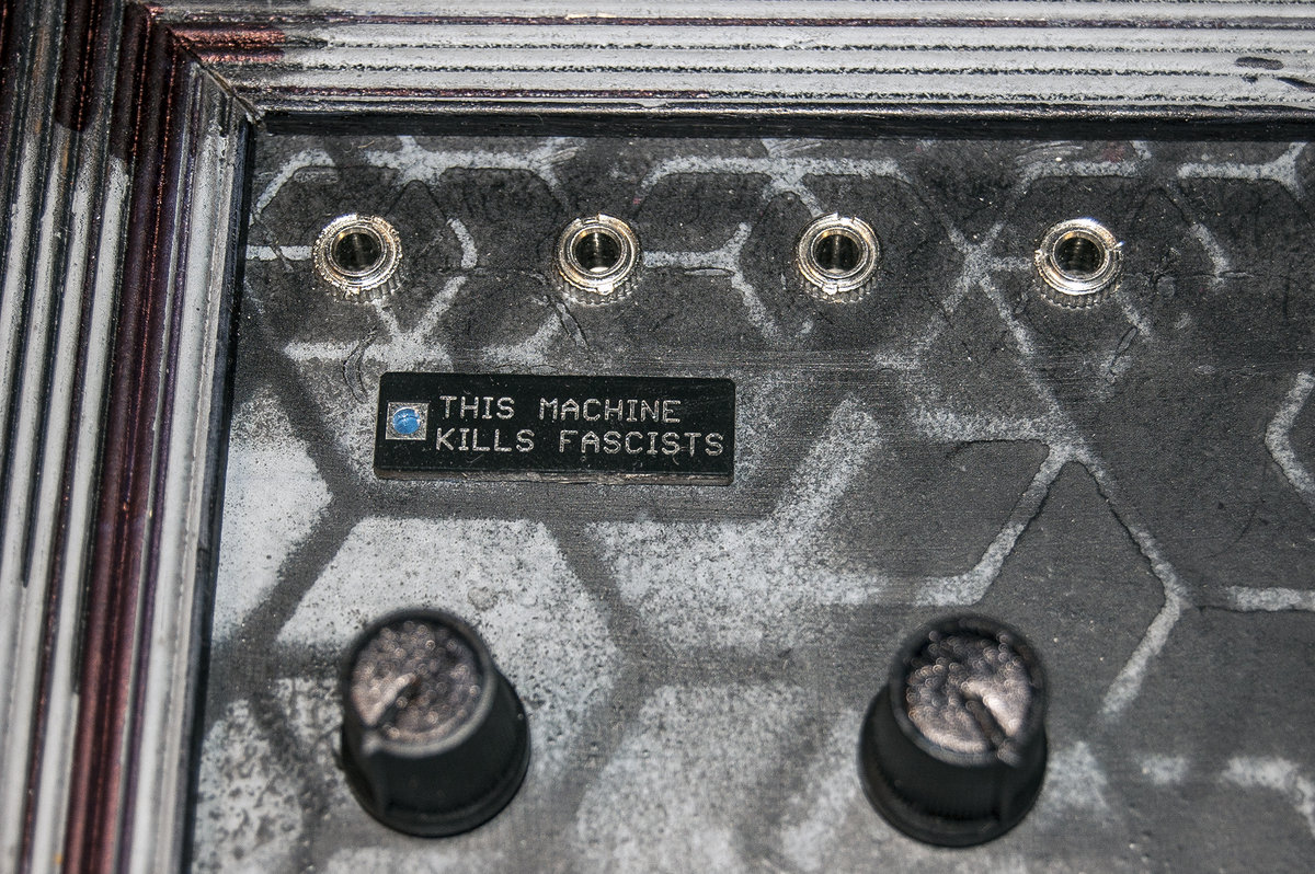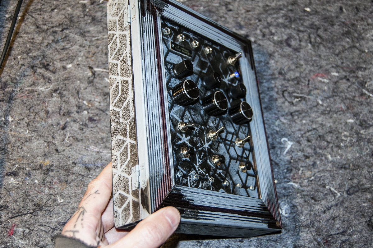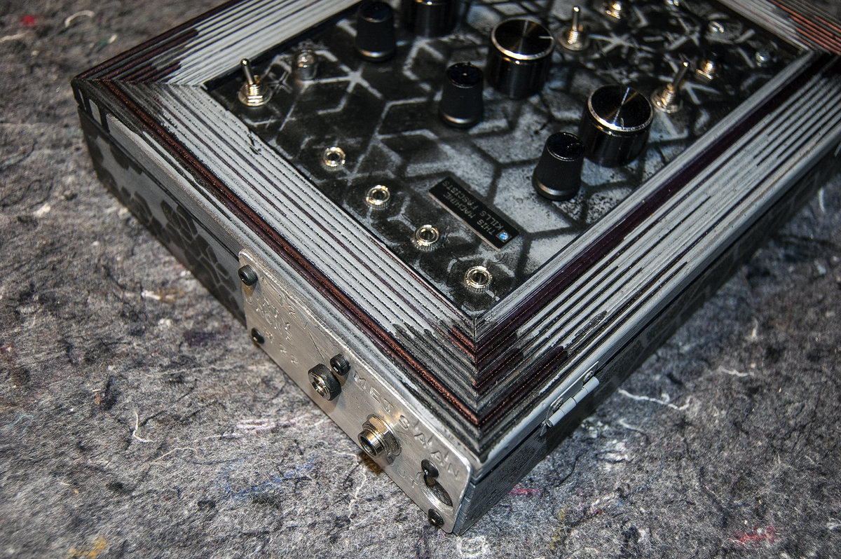 A versatile drone/noise synthbox with powerful resonant low pass filter and modulare gate inputs in recycled wooden enclosure, painted with a grey/black hexagon stencil design and a plastique panel plate. Gate signals have to be <5V DC signals. Handmade by GRM for METSÄÄN.