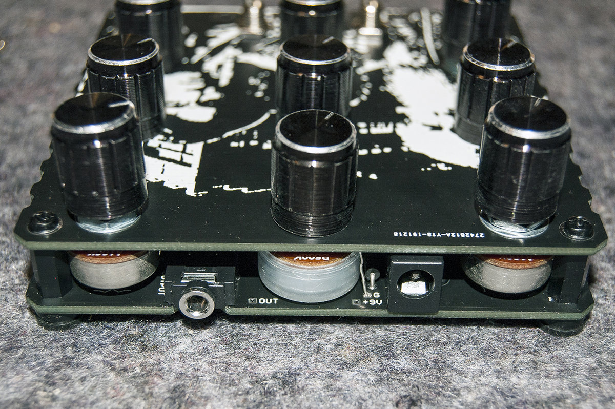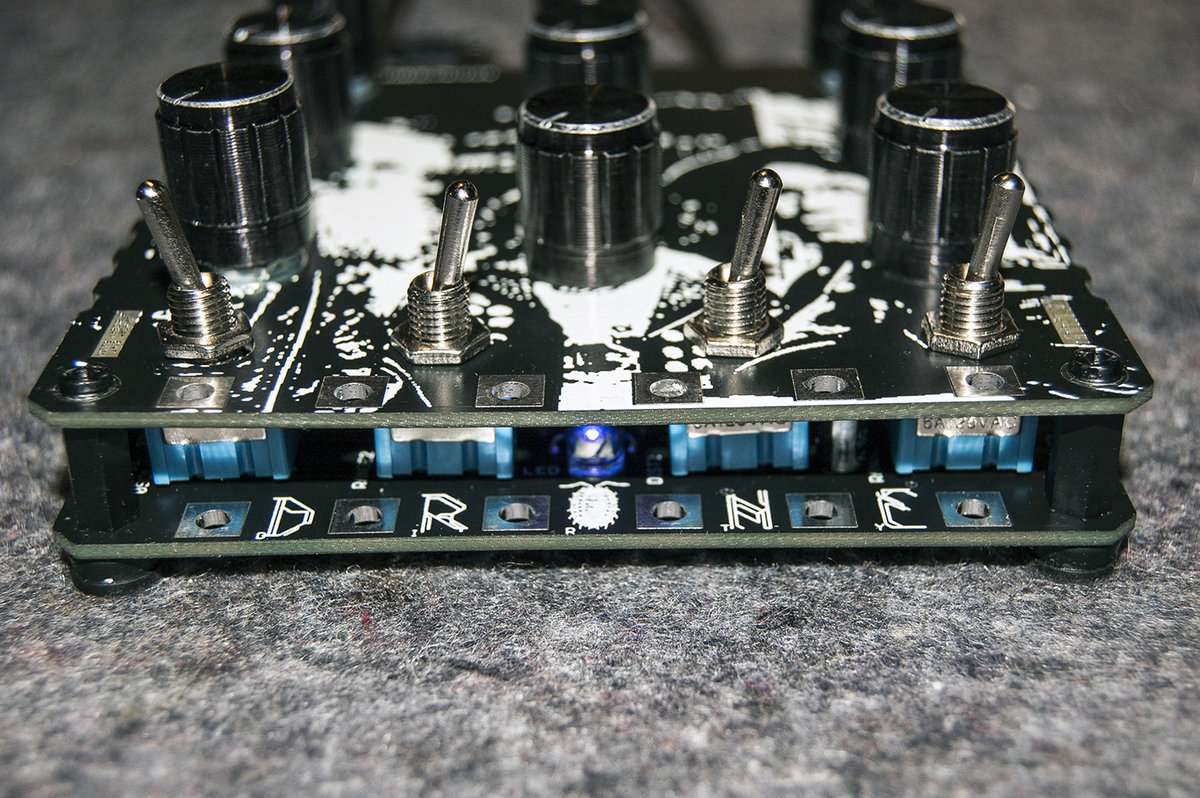 The 3 triangle wave oscillators (OSC), that are highly interactive with each other in a stochastic manner create a wide array of wave forms by a number of different modulations, from subtle to harsh. 3 FREQUENCY control pots control the pitch of OSC1,2+3. Toggle switches select a high or a low RANGE setting for OSC2+3. OSC1 has a DEPTH toggle switch and OSC2 has an additional toggle switch to disable the DISTORT2 pot. OSC2+3 have a dedicated DISTORT control pot, that depending on the other settings, add a bit ‘edge’ to their wave forms. The 12 BODYCONTACTS let you become part of the circuit. When you touch them the conductivity of your skin (if not too dry) becomes a further way of modulating the sounds, (be careful with the top row, they can ‘boost’ the volume quite a bit). from here the signal goes to the FILTER, which is depending on the status of the rest of the settings is also highly reactive to internal modulations. OVERLOAD is a pot that determines how hard the filter is driven (and works in reverse, from high to low). CUTOFF is the cutoff frequency of the RESONANT LOW PASS FILTER and RESONANCE controls, what it says. VOLUME controls the global volume of OUTPUT comes from a 3.5mm stereo socket (the signal is MONO, meaning both channels carry the same signal). By the way, the circuit board is ‘hackable’ on both sides are solder points for the OSCs individual outputs and a prefilter sum as well as connections for external switches (for the ones already on the board). With you could use for example tilt switches or integrate gates for sequencing.