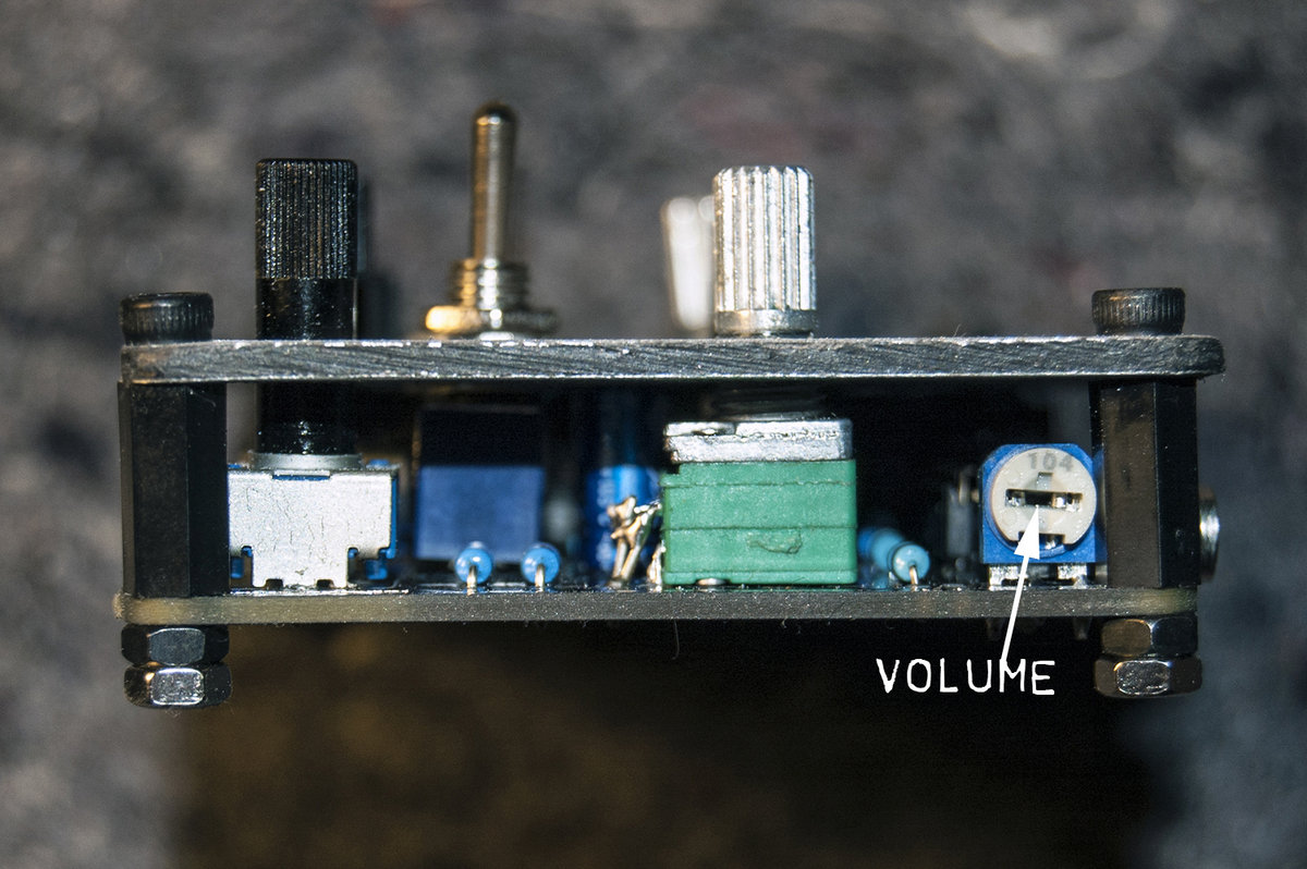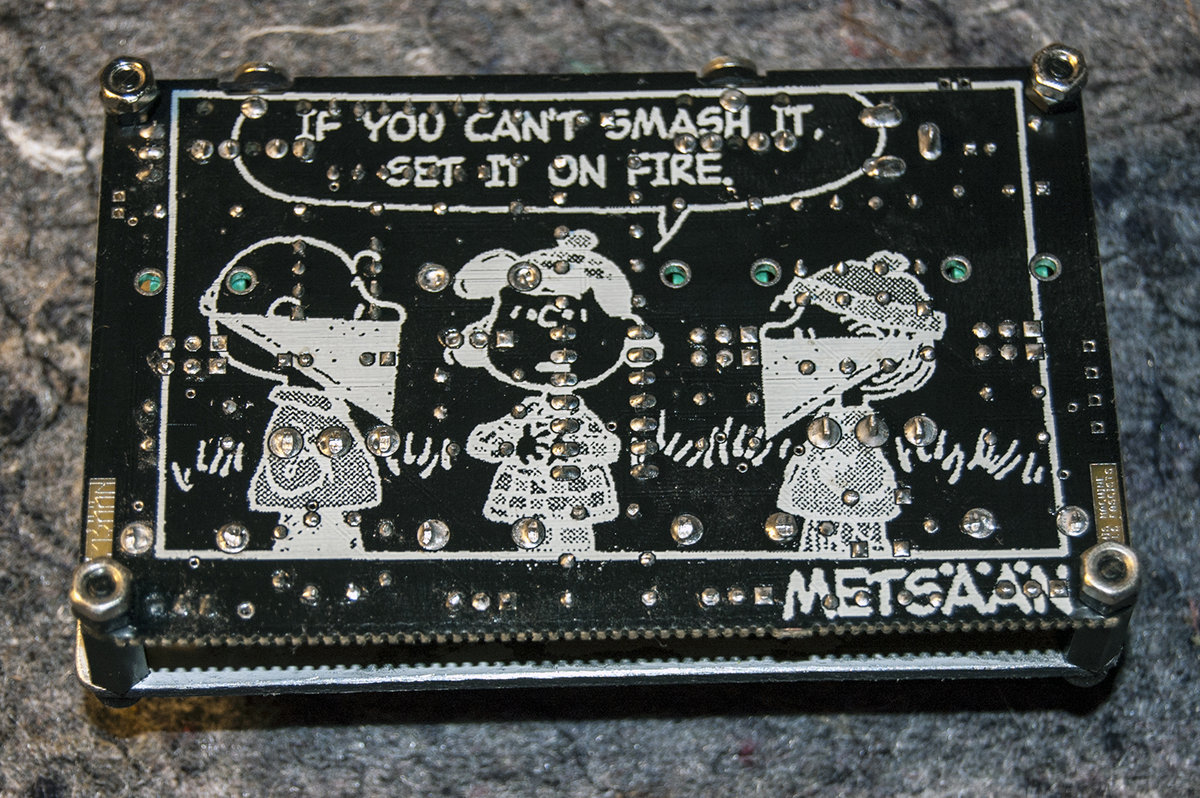 DIRTY DRONE SMASHISM is a small and raw drone synth with 2 synced SQUARE WAVE OSCILLATROS pairs, each with an OFF-SET dial for one of them. A 3 position toggle switch selects one of the pairs (1/2 with a lower or 2/4 with a higher frequency range) or all 4 oscillators, when in the middle position (basically this is one half of the stereo DIRTY DRONE DEFROST). The complex waveform generated by the oscillators runs through a powerful resonant filter (based one the TOTAL CONTROL FILTER), which offers control over the LOW and the HIGH end with a dedicated pot, to attenuate the frequency or increase it towards slight distortion). additionally it has a RESONANCE control with an extra BOOST that can be engaged by a toggle switch (left position). And of course a FILTER FREQUENCY pot for a wide sweep through the frequency spectrum. The output VOLUME can be set with a trimmer that is accessible on the side, next to the 3.5mm mini jack output. An additional 3.5mm mini jack input allows to add external audio signals to the drones and let them run through the filter as well (for some oldschool industrial vibes.) Faceplate made from a repurposed traffic sign and build in a ‘barebones’ style so on the bottom all solder points are accessible for circuit bending by body contact and some free solderpoints for the output of the individual oscillators, in cae you feel like experimenting with that). Always remember, kids: IF YOU CAN’T SMASH IT, SET IT ON FIRE.