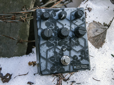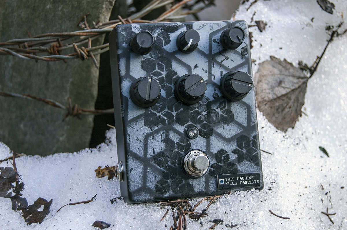 The ECHOBLENDER #10 is based on the “Echobender” by Casper Electronics with some tweaks for better control. It is housed in a black die cast aluminum enclosure painted with a broken hexagon stencil work. The controls, from upper left to lower right: DRY VOLUME, FEEDBACK (DISTORTION), WET VOLUME, FINE TIME, COARSE TIME, REPEATS.