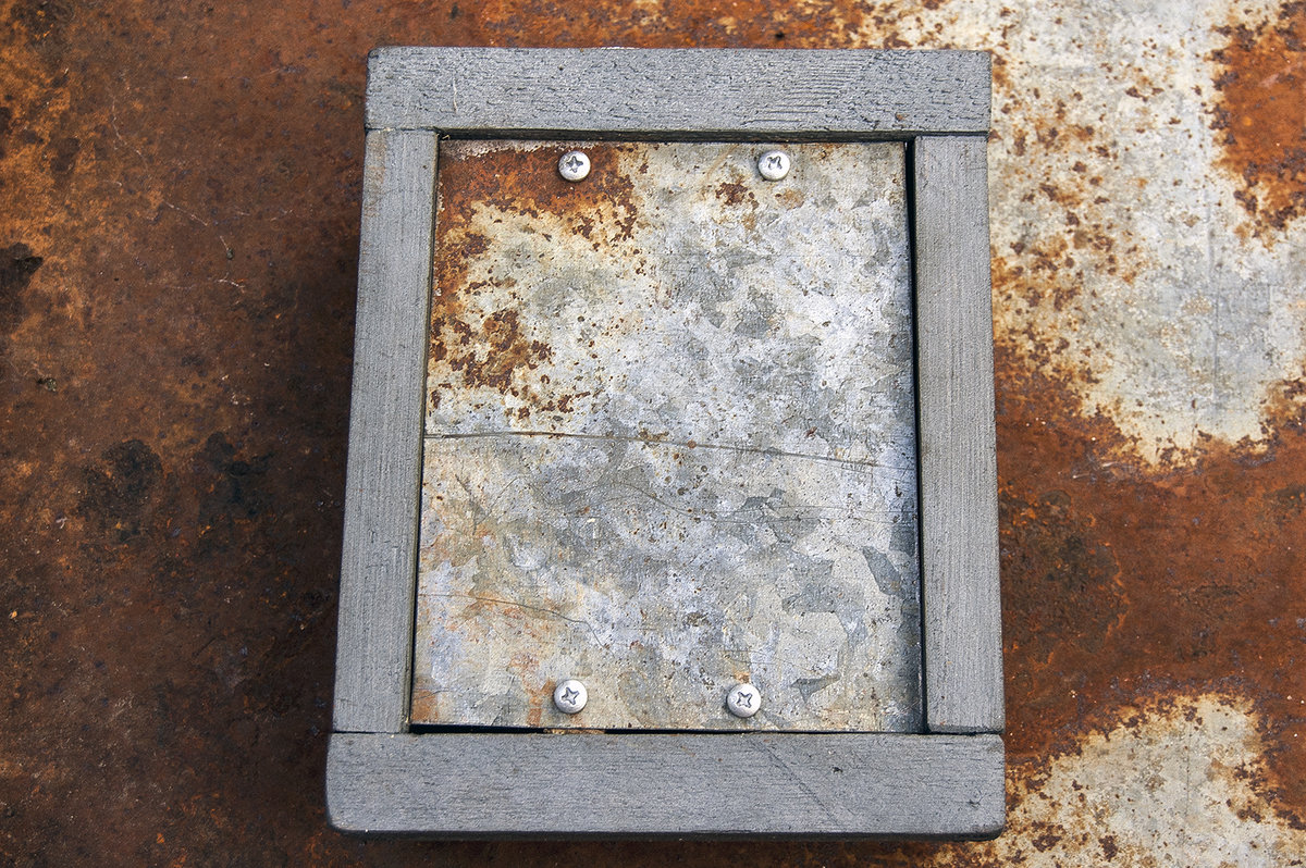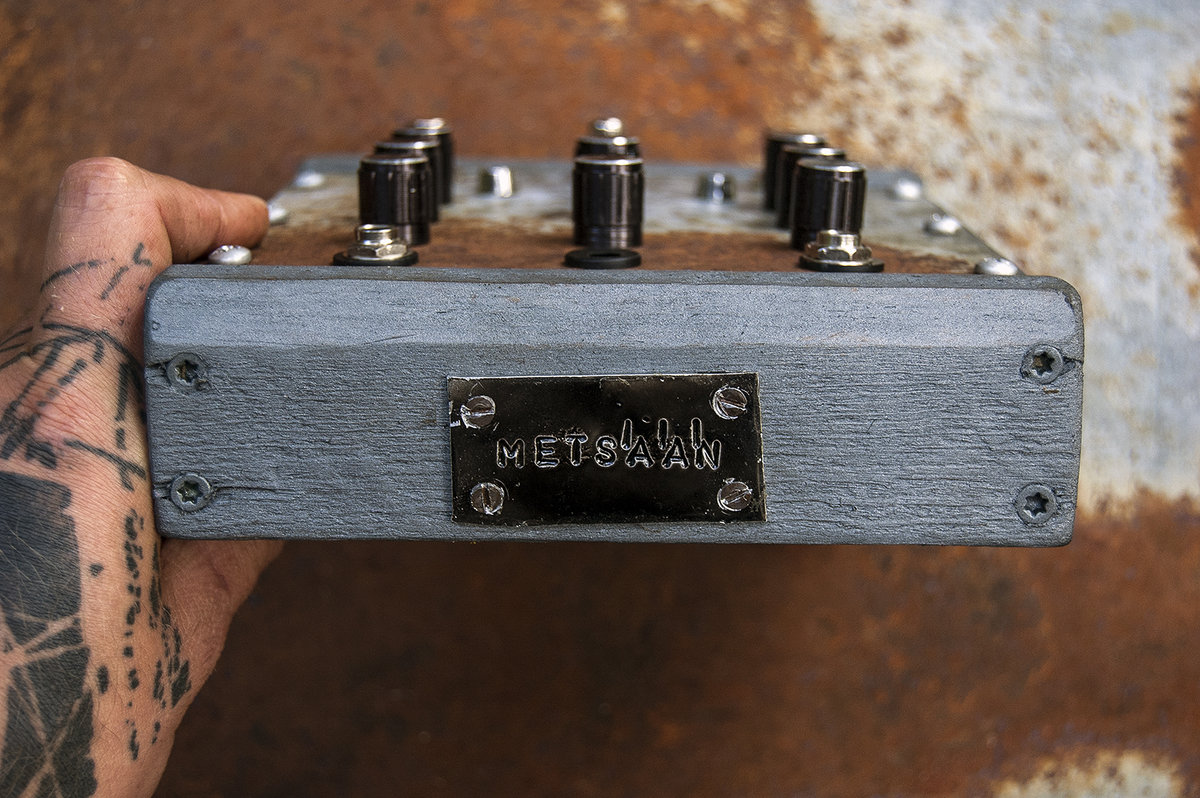 The enclosure is handmade by grm from recycled materials. The wooden frame is made from cut-off boards of the METSÄÄN studios annex construction site, painted with a metallic grey paint, mixed from two old found paint cans. The faceplate and bottom is cut from a huge piece of a rusty zinced iron sheet, that i found in out yard from previous inhabitants, who luckily were hoarders (KEEPERS) as well. (The price does not include power adapter, it should be fine with a one-spot solution.)
