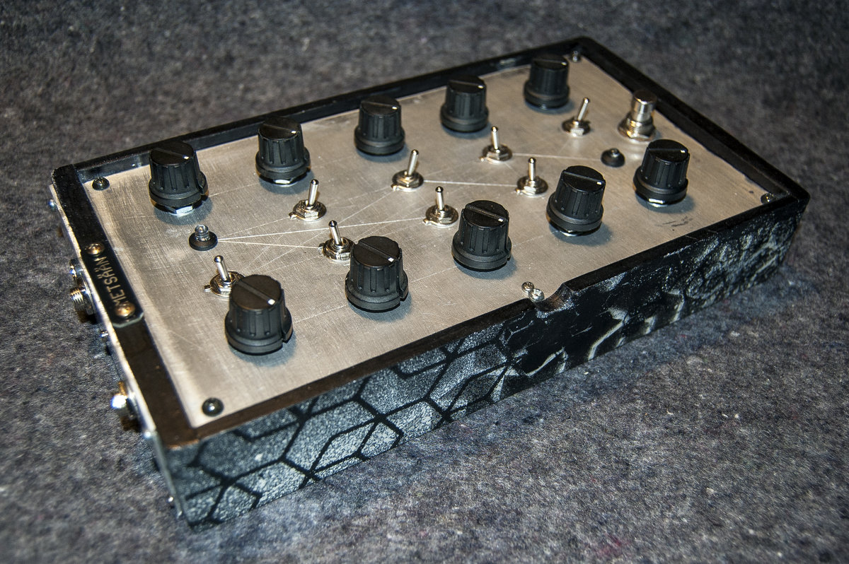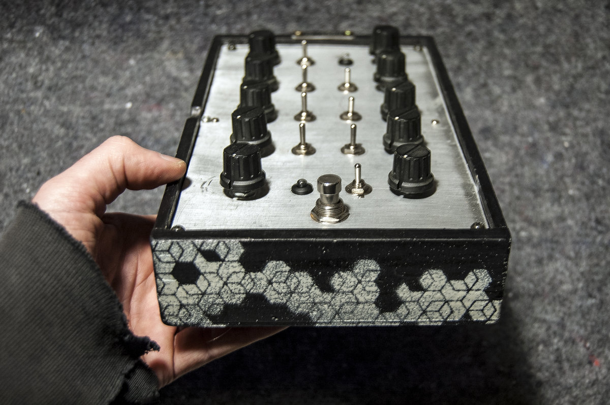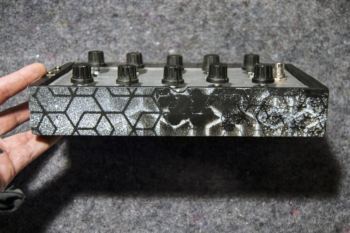 The 4 square wave oscillators with different frequency ranges ca be individually switched on or off with a toggle switch and have a FREQUENCY pot each. The 2 LFOs can each be routed to modulate one of the oscillators (LFO1> OSC1/OFF/OSC2) and (LFO2> OSC3/OFF/OSC4) or switched off with 2 3-position toggle switches. All oscillators are affected by the STARVE pot, that limits the power they can draw, resulting in stochastic noises, when the different gates of the IC battle for power. When the power toggle switch is in the ‘off’ position, the TRIGGER stomp switch can be used for pulsed power supply, the decay of those pulses is controlled by the STARVE pot, indicated by a fading ultraviolet LED. If a (boosted) audio signal is send to the INPUT, it can either run through pretty clear or through a PRE-AMP stage with adjustable GAIN. The PRE-AMP can be switched on or off with a toggle-switch and has an effect on the overall sound, even when there is no audio input. A MIX pot allows to blend the internal and incoming signals and a global VOLUME pot can be used to ‘tame’ the OUTPUT signal.