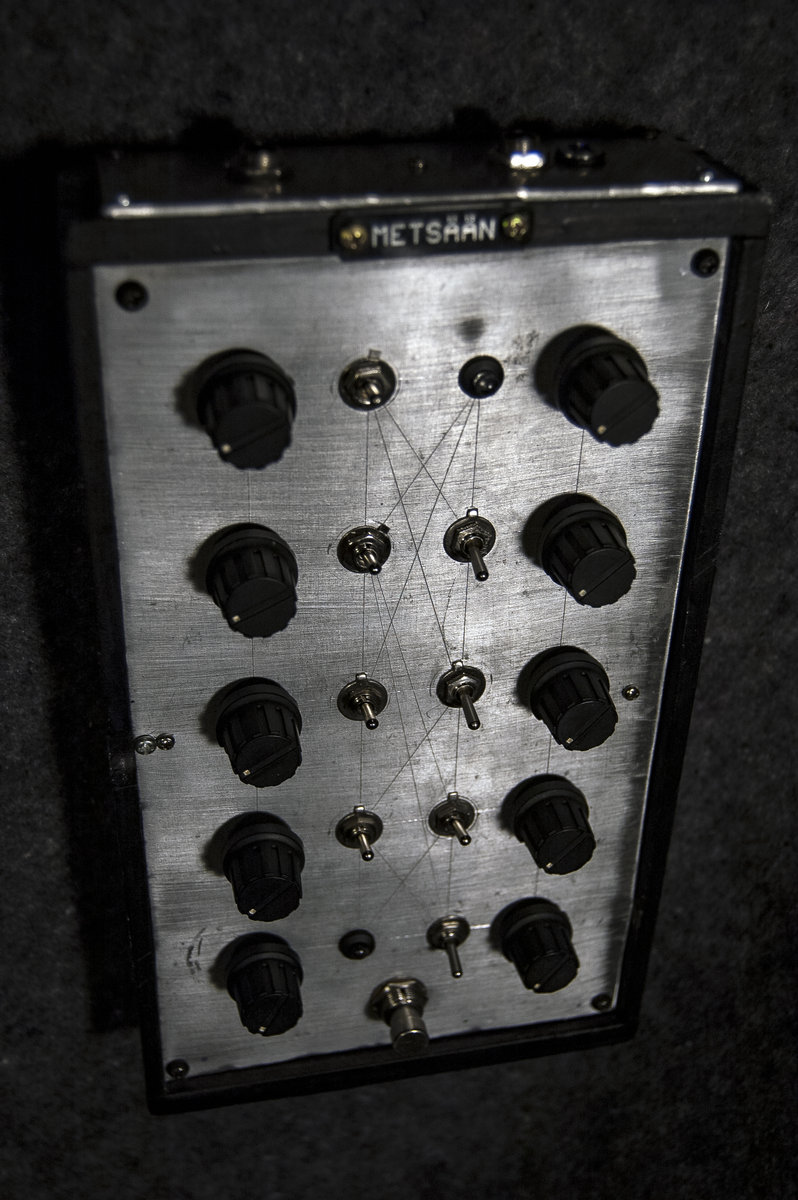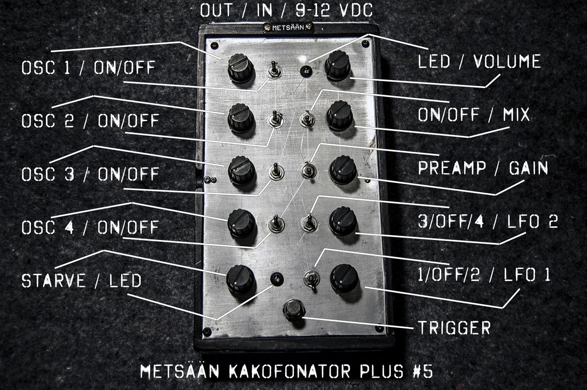 The KAKOFONATOR PLUS #5 is housed in a black handmade wooden box with a scratched aluminum face plate and stencil artwork. It works as a standalone noise generator and as a device that interacts with audio input signals.