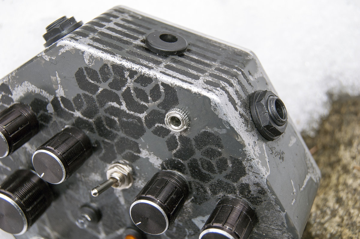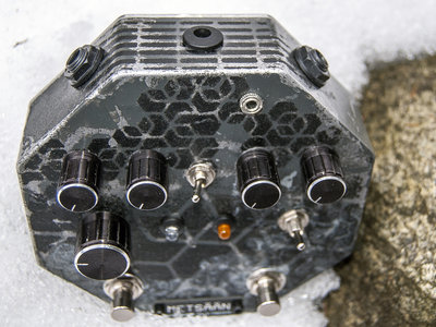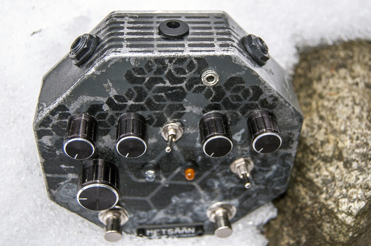 The WASP FILTER PEDAL #1 contains the notorious multi-mode filter section of the EDP WASPsynth for the signals of your choice, housed in a sturdy octagonal die cast aluminum enclosure with stenciled artwork. The 4 FILTER MODES are SELECTED by the big knob (up to down: LOW PASS, BAND PASS, HIGH PASS and NOTCH). A the input signal is controlled with the GAIN control. A dedicated RESONANCE control determines the feedback at the CUTOFF point, that of course is determined by the most important control. Furthermore the RESONANCE has two settings (EXTREME/NORMAL) that are selected with the upper toggle switch. In HIGH PASS mode the filter is can self-oscillate to generate a SINE WAVE and the FREQUENCY can be dialed in with the CUTOFF control, this control has also a mono mini jack input for external CV (0-5V DC), which allows to play the filter like an sine wave oscillator or modulate. Otherwise the CV allows to modulate the filter’s CUTOFF with external gear (see demo video). The left stomp switch is the TRUE BYPASS (with ultraviolet indicator LED) and the right stomp switch engages the DISTORTION (with orange indicator LED), which has a TREBLE BOOST that engages by flipping the lower toggle switch. A VOLUME control allows to attenuate the OUTPUT of the filter. Handmade by GRM for METSÄÄN.